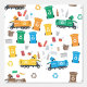 A cute colourful recycling garbage truck pattern with recycling bins and recyclables. Green, blue, yellow, brown and orange recycling garbage trucks recycling paper, plastic, metal, glass and compost. Perfect for any garbage truck enthusiast big or small.