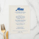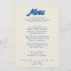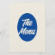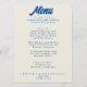 A colourful retro funky modern bright wedding dinner menu. Which features chic template design of boho vintage beige milky background and blue typography and vintage bold menu in blue. Perfect and easy editable menu which is matching with the whole suite.