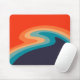 Abstract illustration of colourful retro style swirls decoration in beige, pastel orange, orange and turquoise colours on navy blue background.