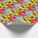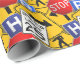 This all occasion gift wrapping paper features a bright and colourful collage of yellow, red, and white traffic signs, including a stop sign and a speed limit sign. Cute, and very unique.