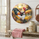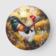 Rise and shine wall clock featuring a colourful painting of two roosters at sunrise. The numbers are optional.