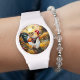 Rise and shine watch featuring a colourful painting of two roosters at sunrise. The numbers are optional.