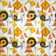 A colourful and cute road construction themed fabric for kids with works tractor, road traffic cones, warning signs and tools all on a white background.
