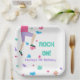 Rock on! The climbing wall with colourful holds is in fun watercolor texture. Text reads "Rock On" with room for the birthday girl or boy's message below. Perfect plates for a rock climbing theme birthday party/