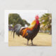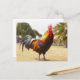 Photograph of a handsome colourful rooster standing on grass with trees in background.