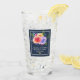 Wedding commemorative drinking glass with a fanciful floral bouquet with watercolor roses. Stylish, whimsical and creative. A bundle of roses in pink, purple and yellow. With lots of sprigs and leaves in green, pink, purple and blue. Background is a navy blue colour. 2 golden wedding rings placed below the text.