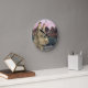 The original cute donkey portrait on this unique clock with numbers is an original pencil drawing of a little donkey I photographed at a festival. This sepia realist art donkey picture is set against an original stylised landscape sunset painting. The original landscape image is a watercolor painting of a few winter trees against a pink sunset sky. This is a customisable clock, you can personalise it with your own text.