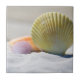 A Beach Photo: colourful seashells sitting in the white sand; purple, orange and yellow.