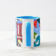 A white ringer mug with a powder blue rim and handle and a handpainted paper collage of a bright and colourful seaside scene. See also matching greeting card, poster, gifts and apparel.