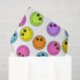 Orange, pink, purple, green, blue, and yellow smiling emoji faces on a white background cover this tissue paper.