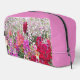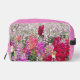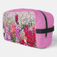 Zippered dopp kit toiletry bag that features the photo image of a summer garden with colourful Snapdragons and little, pink and white Nicotiana flowers, with solid pink top and side panels. A lovely, floral design! Perfect accessory bag for your toiletries for on-the-go travel!