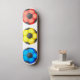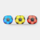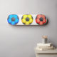 Illustration of a blue, yellow and red soccer ball standing in a row.