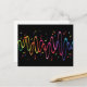 Black postcard featuring colourful sound waves and musical notes on a black background.