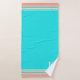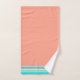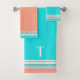 Southwestern inspired bath towel set done in coral, turquoise, orange, green and pink. The orange hand towel and the turquoise wash cloth and bath towel have graphics of a colourful tribal pattern ribbon, along the edge of the towels. Personalise the white single letter monogram, on the bath towel, to suit your needs.
