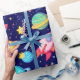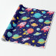 A vibrant seamless pattern showcasing cartoon rockets, planets, stars, and galaxies against a dark background.