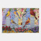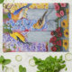 A beautifully painted scene of a variety of songbirds in a garden blooming with colourful spring flowers. Several species of birds sit on a white picket fence within the garden. Bird species include male and female American Goldfinches, an Eastern Bluebird, a Black-capped Chickadee, and a pair of male and female Northern Red Cardinals. Flower species included blue, purple, and yellow larkspur (delphinium), pink, red, and purple calibrachoa, and yellow-orange Black-Eyed Susan daisies. Realistic artwork created from an original oil painting by equine and wildlife artist Crista S. Forest.