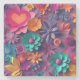 A stone coaster with a cool digital 3d style pattern. Bright and colourful flowers with a cool style which looks like paper cutouts. Fun and fanciful design.