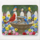 A spring gathering of colourful birds and flowers around a pretty water fountain birdbath.