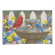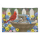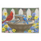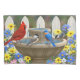 A spring gathering of colourful birds and flowers around a pretty water fountain birdbath.