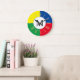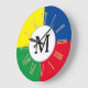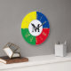 This stylish custom wall clock features a vibrant, colourful, modern design. Each corner features a different bright colour. Blue, red, green, and yellow frame a sample monogram initial in the centre. You can personalise the clock to include your own custom initial or other text. THe hours are printed in a gold Roman numeral pattern.