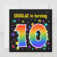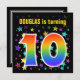 This fun, exciting, and vibrant birthday party invitation design features a colourful star shapes pattern, along with the number "10" featuring a multicolored rainbow like spectrum or gradient pattern. The name on the front can be customised. The back features custom details about the party. Birthday party invitations like this might be sent to invite guests to a birthday party being held to celebrate somebody’s tenth birthday. [~Z0000349]