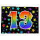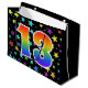 This exciting, fun, and vibrant gift bag design features a colourful stars pattern, along with the number "13" having a multicolored rainbow inspired spectrum gradient pattern, on a black coloured background. A gift bag like this might be a fun way to wrap presents or gifts being given for somebody’s thirteenth birthday, or perhaps for a couple’s thirteenth wedding anniversary, or some other 13th event. [~Z0000347]