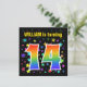 This exciting, fun, vibrant birthday party invitation design features a colourful stars pattern, along with the number "14" having a multicolored rainbow inspired spectrum or gradient pattern. The name on the front can be customised. The back features customisable details about the party. Birthday party invitations like this might be sent to potential attendees for a birthday party being held to celebrate somebody’s fourteenth birthday. [~Z0000349]