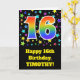 The front of this exciting, fun, and vibrant birthday greeting card design features a colourful stars pattern, along with the number "16" having a multicolored rainbow inspired spectrum gradient pattern, on a black coloured background. The front also features a birthday greeting message, including a customisable recipient name. The inside features a customisable birthday greeting message, or could perhaps be cleared and left blank if a message is to be written by hand instead. A personalised birthday card like this might be a fun way to send a message in celebration of somebody’s sixteenth birthday. [~Z0000348]