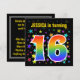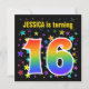 This exciting, fun, vibrant birthday party invitation design features a colourful stars pattern, along with the number "16" having a multicolored rainbow inspired spectrum or gradient pattern. The name on the front can be customised. The back features customisable information about the party. Birthday party invitations like this might be sent to invite guests to a birthday party being held to celebrate somebody’s sixteenth birthday. [~Z0000349]