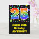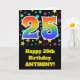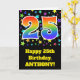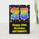 The front of this exciting, fun, and vibrant birthday greeting card design features a colourful pattern of star shapes, along with the number "25" featuring a multicolored rainbow spectrum like gradient pattern, on a black coloured background. The front also features a birthday greeting message, including a custom recipient name. The inside features a custom birthday greeting message, or could perhaps be cleared and left blank if a message is to be written by hand instead. A customisable birthday card like this might be a fun way to acknowledge somebody’s twenty fifth birthday. [~Z0000348]