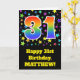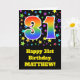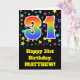 The front of this exciting, fun, and vibrant birthday greeting card design features a colourful star field inspired pattern, along with the number "31" having a multicolored rainbow spectrum like gradient pattern, on a black coloured background. The front also features a birthday greeting message, including a customisable recipient name. The inside features a customisable birthday greeting message, or could perhaps be cleared and left blank if a message is to be written by hand instead. A customisable birthday card like this might be a fun way to acknowledge somebody’s thirty first birthday. [~Z0000348]