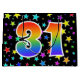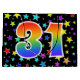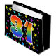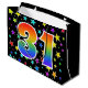 This exciting, fun, and vibrant gift bag design features many colourful star shapes, along with the number "31" featuring a multicolored rainbow inspired spectrum gradient pattern, on a black coloured background. A gift bag like this could perhaps be a fun way to wrap presents or gifts being given for somebody’s thirty first birthday, or perhaps for a couple’s thirty first wedding anniversary, or some other 31st event. [~Z0000347]
