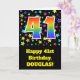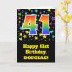 The front of this exciting, fun, and vibrant birthday greeting card design features numerous colourful star shapes, along with the number "41" featuring a multicolored rainbow inspired spectrum gradient pattern, on a black coloured background. The front also features a birthday greeting message, including a custom recipient name. The inside features a custom birthday greeting message, or could perhaps be cleared and left blank if a message is to be written by hand instead. A personalised birthday card like this might be a fun way to send birthday wishes to somebody who is celebrating their forty first birthday. [~Z0000348]