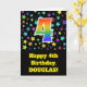 The front of this exciting, fun, and vibrant birthday greeting card design features a colourful star field pattern, along with the number "4" having a multicolored rainbow spectrum like gradient pattern, on a black coloured background. The front also features a birthday greeting message, including a personalised recipient name. The inside features a personalised birthday greeting message, or could perhaps be cleared and left blank if a message is to be written by hand instead. A personalised birthday card like this might be a fun way to acknowledge somebody’s fourth birthday. [~Z0000348]