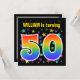 This exciting, fun, vibrant birthday party invitation design features a colourful stars pattern, along with the number "50" having a multicolored rainbow inspired spectrum or gradient pattern. The name on the front can be customised. The back features custom details about the party. Birthday party invitations like this might be used to invite guests to a birthday party being held to celebrate somebody’s fiftieth birthday. [~Z0000349]