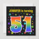 This exciting, fun, vibrant birthday party invitation design features a colourful stars pattern, along with the number "51" having a multicolored rainbow inspired spectrum or gradient pattern. The name on the front can be customised. The back features custom details about the party. Birthday party invitations like this might be used to invite guests to a birthday party being held to celebrate somebody’s fifty first birthday. [~Z0000349]