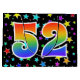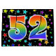 This exciting, fun, and vibrant gift bag design features a pattern of colourful star shapes, along with the number "52" having a multicolored rainbow inspired spectrum gradient pattern, on a black coloured background. A gift bag like this could perhaps be a fun way to wrap presents or gifts being given for somebody’s fifty second birthday, or perhaps for a couple’s fifty second wedding anniversary, or some other 52nd event. [~Z0000347]