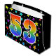 This exciting, fun, and vibrant gift bag design features a pattern of colourful star shapes, along with the number "53" having a multicolored rainbow inspired spectrum gradient pattern, on a black coloured background. A gift bag like this might be a fun, happy way of wrapping gifts or presents being given for somebody’s fifty third birthday, or perhaps for a couple’s fifty third wedding anniversary, or some other 53rd event. [~Z0000347]