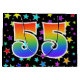This exciting, fun, and vibrant gift bag design features many colourful star shapes, along with the number "55" featuring a multicolored rainbow inspired spectrum gradient pattern, on a black coloured background. A gift bag like this could perhaps be a fun and happy way of wrapping gifts or presents being given for somebody’s fifty fifth birthday, or perhaps for a couple’s fifty fifth wedding anniversary, or some other 55th event. [~Z0000347]