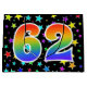 This exciting, fun, and vibrant gift bag design features a colourful star shapes pattern, along with the number "62" featuring a multicolored rainbow spectrum like gradient pattern, on a black coloured background. A gift bag like this might be a fun, happy way of wrapping gifts or presents being given for somebody’s sixty second birthday, or perhaps for a couple’s sixty second wedding anniversary, or some other 62nd event. [~Z0000347]