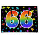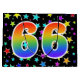 This exciting, fun, and vibrant gift bag design features a pattern of colourful star shapes, along with the number "66" having a multicolored rainbow inspired spectrum gradient pattern, on a black coloured background. A gift bag like this could perhaps be a fun way to wrap presents or gifts being given for somebody’s sixty sixth birthday, or perhaps for a couple’s sixty sixth wedding anniversary, or some other 66th event. [~Z0000347]