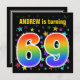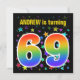This exciting, fun, vibrant birthday party invitation design features a colourful pattern of star shapes, along with the number "69" featuring a multicolored rainbow like spectrum or gradient pattern. The name on the front can be customised. The back features personalised details about the party. Birthday party invitations like this might be sent to potential attendees for a birthday party being held to celebrate somebody’s sixty ninth birthday. [~Z0000349]