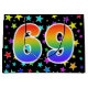 This exciting, fun, and vibrant gift bag design features a colourful stars pattern, along with the number "69" having a multicolored rainbow inspired spectrum gradient pattern, on a black coloured background. A gift bag like this could perhaps be a fun and happy way of wrapping gifts or presents being given for somebody’s sixty ninth birthday, or perhaps for a couple’s sixty ninth wedding anniversary, or some other 69th event. [~Z0000347]