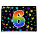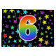 This exciting, fun, and vibrant gift bag design features numerous colourful star shapes, along with the number "6" featuring a multicolored rainbow inspired spectrum gradient pattern, on a black coloured background. A gift bag like this could perhaps be a fun and happy way of wrapping gifts or presents being given for somebody’s sixth birthday, or perhaps for a couple’s sixth wedding anniversary, or some other 6th event. [~Z0000347]