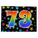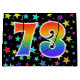 This exciting, fun, and vibrant gift bag design features numerous colourful star shapes, along with the number "73" featuring a multicolored rainbow inspired spectrum gradient pattern, on a black coloured background. A gift bag like this could perhaps be a fun way to wrap presents or gifts being given for somebody’s seventy third birthday, or perhaps for a couple’s seventy third wedding anniversary, or some other 73rd event. [~Z0000347]