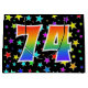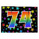 This exciting, fun, and vibrant gift bag design features a colourful star field inspired pattern, along with the number "74" having a multicolored rainbow spectrum like gradient pattern, on a black coloured background. A gift bag like this could perhaps be a fun way to wrap presents or gifts being given for somebody’s seventy fourth birthday, or perhaps for a couple’s seventy fourth wedding anniversary, or some other 74th event. [~Z0000347]