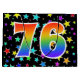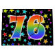 This exciting, fun, and vibrant gift bag design features a colourful star shapes pattern, along with the number "76" featuring a multicolored rainbow spectrum like gradient pattern, on a black coloured background. A gift bag like this might be a fun, happy way of wrapping gifts or presents being given for somebody’s seventy sixth birthday, or perhaps for a couple’s seventy sixth wedding anniversary, or some other 76th event. [~Z0000347]