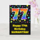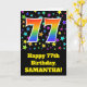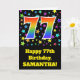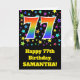 The front of this exciting, fun, and vibrant birthday greeting card design features a colourful pattern of star shapes, along with the number "77" featuring a multicolored rainbow spectrum like gradient pattern, on a black coloured background. The front also features a birthday greeting message, including a customisable recipient name. The inside features a custom birthday greeting message, or could perhaps be cleared and left blank if a message is to be written by hand instead. A customisable birthday card like this might be a fun way to send birthday wishes to somebody who is celebrating their seventy seventh birthday. [~Z0000348]