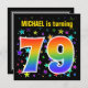 This fun, exciting, and vibrant birthday party invitation design features a colourful pattern of star shapes, along with the number "79" featuring a multicolored rainbow inspired spectrum or gradient pattern. The name on the front can be customised. The back features custom details about the party. Birthday party invitations like this might be used to invite guests to a birthday party being held to celebrate somebody’s seventy ninth birthday. [~Z0000349]