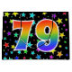This exciting, fun, and vibrant gift bag design features numerous colourful star shapes, along with the number "79" featuring a multicolored rainbow inspired spectrum gradient pattern, on a black coloured background. A gift bag like this might be a fun way to wrap presents or gifts being given for somebody’s seventy ninth birthday, or perhaps for a couple’s seventy ninth wedding anniversary, or some other 79th event. [~Z0000347]